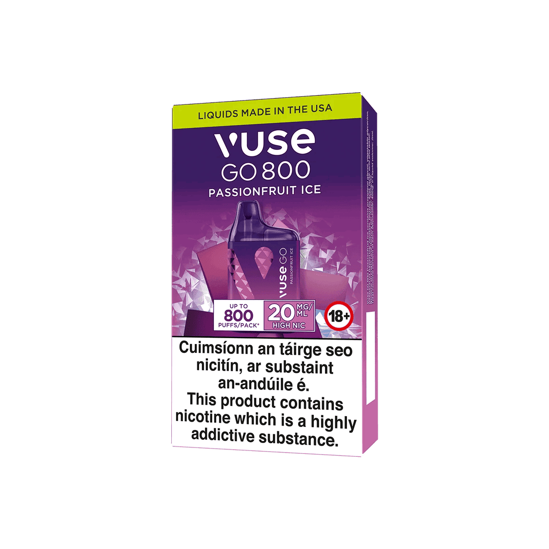 The Passionfruit Ice Vuse GO 800 disposable vape is a way to enjoy vaping when you're on the go. Pre-filled with 2ml of e-liquid with a taste of passionfruit and an ice cool finish, it's easy-view design allows you to see how much is left.